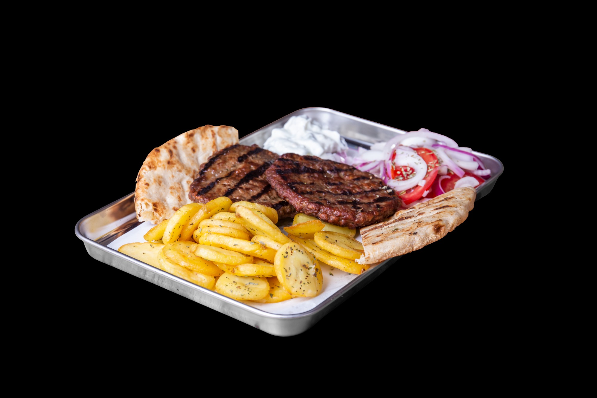 1 *Frigarui de Pui ( 100gr ), 1 *Frigarui de Porc ( 100gr ), 1 *Cotlet de Miel ( 75gr ), 1 *Bifteki de Vita ( 100gr ), *Cartofi Prajiti ( 150gr ), sos Tzatziki ( 100gr ), Ceapa Rosie ( 20gr ), Rosii ( 50gr ), *Lipie Greceasca ( 50gr ), Oregano ( 0,01gr ), sare ( 0,01gr ) - TOTAL 745gr